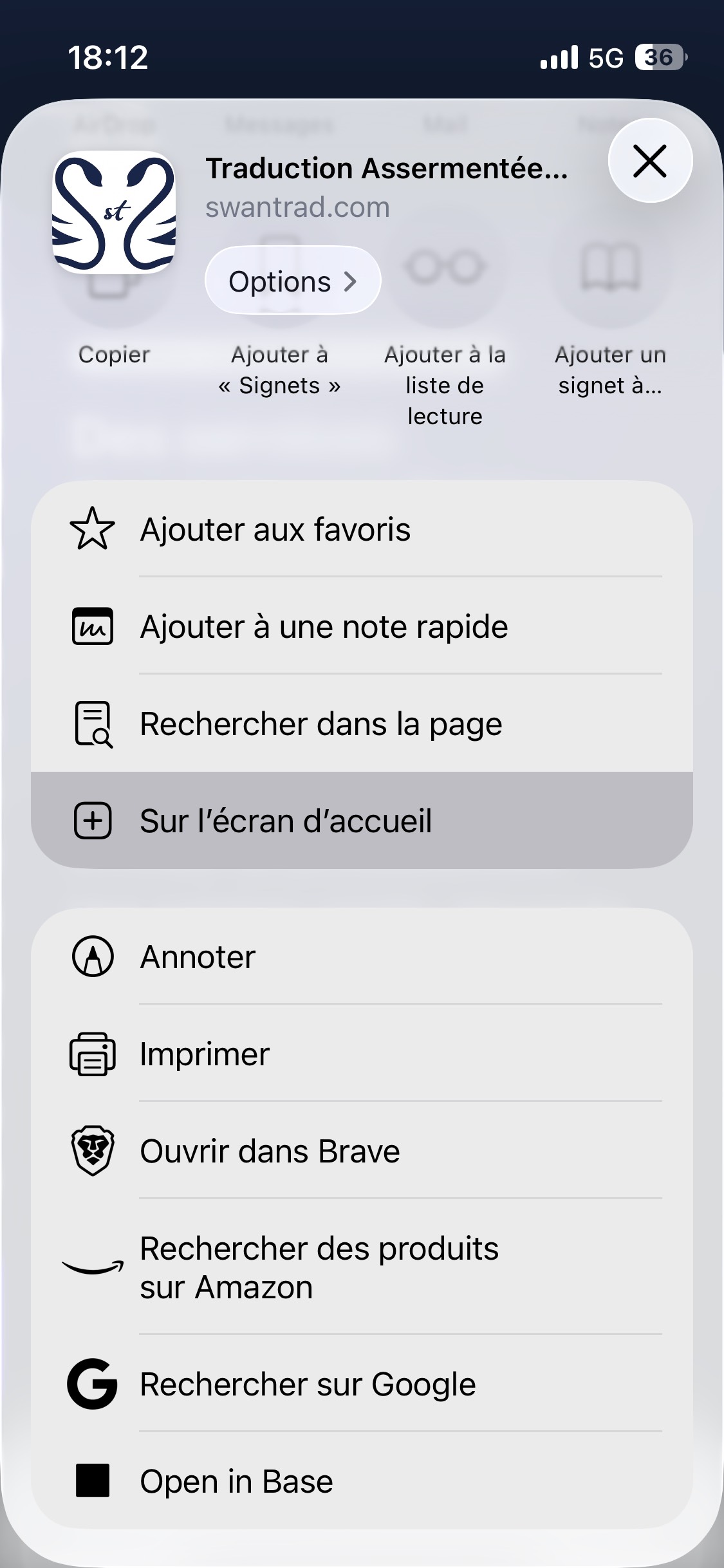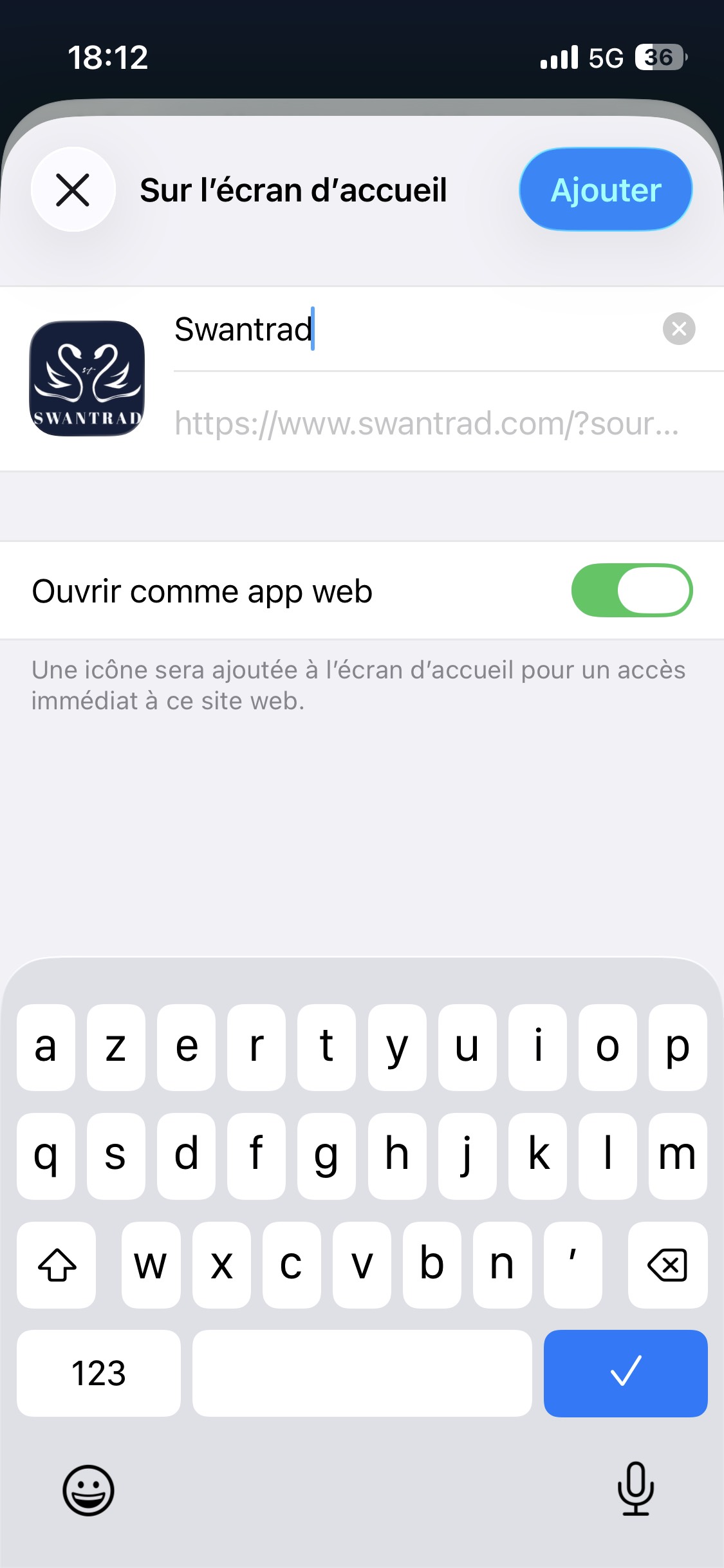 - Confirmez. L’icône Swantrad sera ajoutée à votre écran d’accueil.